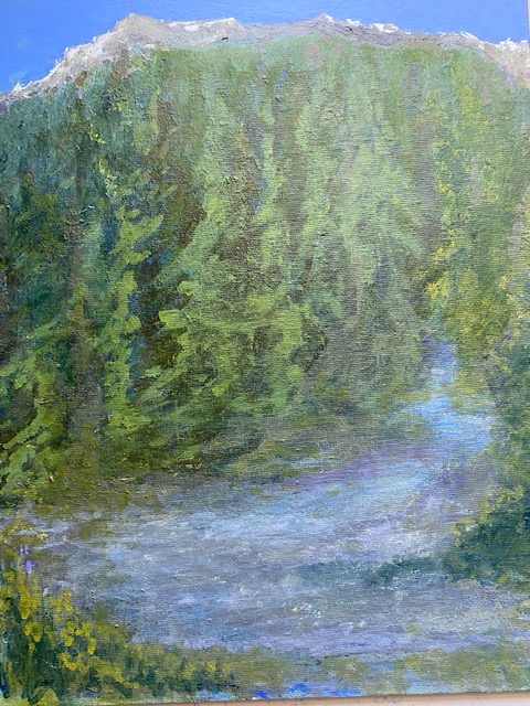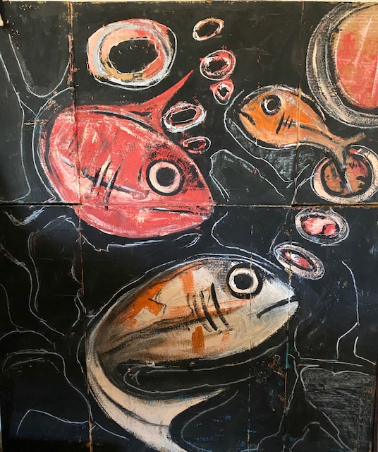 I’m walking with my guitar strapped to my back through a maze of tour buses, pop-up tents, and vendors. I am disoriented as to which direction to go to get back to my campsite, beginning to worry about the safety of my unattended art supplies that I’ve left in my tent. As I round the corner of a tour bus, I see Flea from the band Red Hot Chili Peppers sitting on the ground, disheveled and dusty from a wrestling match he had just had with Anthony Kiedis. Flea was trying to roll himself a cigarette but is using twigs and grass instead of tobacco for the filling. “Is there anything I can do to help you?” I asked. He replied “Don’t you have a painting to finish?”