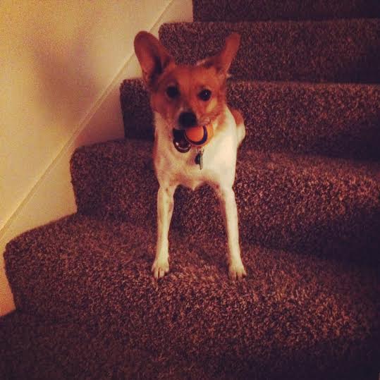 Standing at the bottom of the stairwell, I toss the ball to the top of the landing where Stella waits to make the catch. She then spends a few minutes toying with the ball until she is ready to send it down the stairs to me, then comes racing down to intercept it. She remains undefeated.